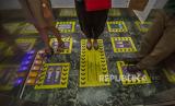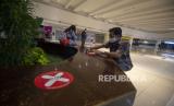 Petugas memasang stiker tanda jaga jarak di Mal Central Park, Jakarta, Rabu (3/6/2020). Selain menerapkan protokol kesehatan ketat, sejumlah pusat perbelanjaan juga menyediakan fasilitas pendukung (FOTO : Antara/Aditya Pradana Putra)