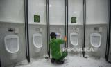 Petugas membersihkan fasilitas toilet dengan berstiker tanda jaga jarak di Mal Central Park, Jakarta, Rabu (3/6/2020). Selain menerapkan protokol kesehatan ketat, sejumlah pusat perbelanjaan juga menyediakan fasilitas pendukung (FOTO : Antara/Aditya Pradana Putra)