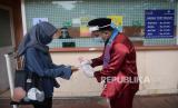 Petugas melayani wisatawan membeli tiket masuk saat berlangsungnya simulasi normal baru di TMII, Jakarta, Kamis (4/6). Pengelola Taman Mini Indonesia Indah (TMII) telah mempersiapkan penerapan protokol kesehatan saat kehidupan normal baru atau (FOTO : Republika/Prayogi)
