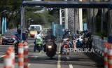 Wisatawan dengan motor melintasi gerbang disinfektan saat berlangsungnya simulasi normal baru di TMII, Jakarta, Kamis (4/6). Pengelola Taman Mini Indonesia Indah (TMII) telah mempersiapkan penerapan protokol kesehatan saat kehidupan normal baru atau (FOTO : Republika/Prayogi)
