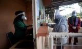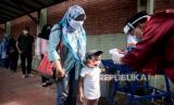 Petugas mengukur suhu tubuh wisatwan saat berlangsungnya simulasi normal baru di TMII, Jakarta, Kamis (4/6). Pengelola Taman Mini Indonesia Indah (TMII) telah mempersiapkan penerapan protokol kesehatan saat kehidupan normal baru atau (FOTO : Prayogi/Republika)