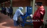 Wisatawan mencuci tangan sebelum mamasuki taman mini saat berlangsungnya simulasi normal baru di TMII, Jakarta, Kamis (4/6). Pengelola Taman Mini Indonesia Indah (TMII) telah mempersiapkan penerapan protokol kesehatan saat kehidupan normal baru atau (FOTO : Prayogi/Republika)