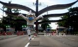 Petugas menggunakan kostum tokoh pewayangan kera putih Hanoman bermasker saat berlangsungnya simulasi normal baru di TMII, Jakarta, Kamis (4/5). Pengelola Taman Mini Indonesia Indah (TMII) telah mempersiapkan penerapan protokol kesehatan saat kehidupan normal baru atau (FOTO : Republika/Prayogi)