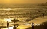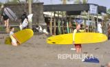 Wisatawan membawa papan selancar di kawasan Pantai Canggu, Badung, Bali, Kamis (4/6/2020). Warga dan wisatawan dari berbagai negara terpantau mengunjungi objek wisata yang sebenarnya masih ditutup dari kunjungan wisatawan sebagai upaya untuk mencegah penyebaran COVID-19 tersebut dengan melewati akses-akses masuk pantai yang tidak dijaga oleh petugas. (FOTO : Antara/Fikri Yusuf)