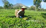 Buruh memetik daun teh di perkebunan Teh Tambi kawasan lereng gunung Sindoro Desa Sigedang, Kejajar, Wonosobo, Jawa Tengah, Kamis (4/6). ekstensifikasi negara tujuan ekspor ke negara-negara di wilayah Timur Tengah, Afrika, Amerika Selatan, termasuk Eropa. (FOTO : ANIS EFIZUDIN/ANTARA FOTO)