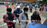 Sejumlah warga mengantre pembayaran pajak kendaraan bermotor pada mobil Samsat Keliling di area GOR Pajajaran, Kota Bogor, Jawa Barat, Kamis (4/6/2020). Badan Pendapatan Daerah (Bapenda) Provinsi Jawa Barat resmi memperpanjang program Triple Untung hingga 31 Juli 2020 mendatang yaitu bebas denda pajak kendaraan bermotor, bebas pokok dan denda BBNKB II (Bea Balik Nama Kendaraan Bermotor) serta bebas tarif progresif pokok tunggakan sebagai salah satu langkah dalam masa adaptasi tatanan baru (new normal) (FOTO : ANTARA/ARIF FIRMANSYAH)