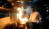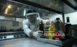Karyawan dengan menggunakan pelindung wajah memasak di dapur The Margo Hotel, Depok, Jawa Barat, Jumat (5/6). Sejumlah hotel mulai mempersipakan Standar Operesional Prosedur (SOP) saat kehidupan normal baru (New Normal) mulai diterapkan, salah satunya The Margo Hotel yang sudah melakukan protokol kesehatan ketat diantaranya penggunaan alat pelindung wajah, kacamata, masker, sarung tangan dam penyemprotan cairan disinfektan dalam upaya mencegah Covid-19 (FOTO : Prayogi/Republika)