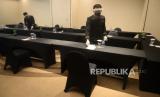 Karyawan dengan menggunakan pelindung wajah menata ruang meting yang telah diatur jaraknya di The Margo Hotel, Depok, Jawa Barat, Jumat (5/6). Sejumlah hotel mulai mempersipakan Standar Operesional Prosedur (SOP) saat kehidupan normal baru (New Normal) mulai diterapkan, salah satunya The Margo Hotel yang sudah melakukan protokol kesehatan ketat diantaranya penggunaan alat pelindung wajah, kacamata, masker, sarung tangan dam penyemprotan cairan disinfektan dalam upaya mencegah Covid-19 (FOTO : Prayogi/Republika)