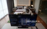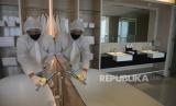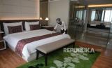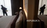 Karyawan membersihkan ruang kamar The Margo Hotel, Depok, Jawa Barat, Jumat (5/6). Sejumlah hotel mulai mempersipakan Standar Operesional Prosedur (SOP) saat kehidupan normal baru (New Normal) mulai diterapkan, salah satunya The Margo Hotel yang sudah melakukan protokol kesehatan ketat diantaranya penggunaan alat pelindung wajah, kacamata, masker, sarung tangan dam penyemprotan cairan disinfektan dalam upaya mencegah Covid-19 (FOTO : Prayogi/Republika)