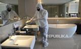 Karyawan menyemprotkan disinfektan di ruang kamar The Margo Hotel, Depok, Jawa Barat, Jumat (5/6). Sejumlah hotel mulai mempersipakan Standar Operesional Prosedur (SOP) saat kehidupan normal baru (New Normal) mulai diterapkan, salah satunya The Margo Hotel yang sudah melakukan protokol kesehatan ketat diantaranya penggunaan alat pelindung wajah, kacamata, masker, sarung tangan dam penyemprotan cairan disinfektan dalam upaya mencegah Covid-19 (FOTO : Prayogi/Republika)