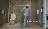 Karyawan membersihkan kamar mandi di ruang kamar The Margo Hotel, Depok, Jawa Barat, Jumat (5/6). Sejumlah hotel mulai mempersipakan Standar Operesional Prosedur (SOP) saat kehidupan normal baru (New Normal) mulai diterapkan, salah satunya The Margo Hotel yang sudah melakukan protokol kesehatan ketat diantaranya penggunaan alat pelindung wajah, kacamata, masker, sarung tangan dam penyemprotan cairan disinfektan dalam upaya mencegah Covid-19 (FOTO : Prayogi/Republika)