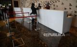 Karyawan dengan menggunakan pelindung wajah melayani tamu di The Margo Hotel, Depok, Jawa Barat, Jumat (5/6). Sejumlah hotel mulai mempersipakan Standar Operesional Prosedur (SOP) saat kehidupan normal baru (New Normal) mulai diterapkan, salah satunya The Margo Hotel yang sudah melakukan protokol kesehatan ketat diantaranya penggunaan alat pelindung wajah, kacamata, masker, sarung tangan dam penyemprotan cairan disinfektan dalam upaya mencegah Covid-19 (FOTO : Prayogi/Republika)