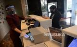 Karyawan dengan menggunakan pelindung wajah melayani tamu di The Margo Hotel, Depok, Jawa Barat, Jumat (5/6). Sejumlah hotel mulai mempersipakan Standar Operesional Prosedur (SOP) saat kehidupan normal baru (New Normal) mulai diterapkan, salah satunya The Margo Hotel yang sudah melakukan protokol kesehatan ketat diantaranya penggunaan alat pelindung wajah, kacamata, masker, sarung tangan dam penyemprotan cairan disinfektan dalam upaya mencegah Covid-19 (FOTO : Republika/Prayogi)