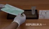 Pekerja hotel menyiapkan masker dan cairan pembersih tangan sebagai (FOTO : Antara/Fikri Yusuf)