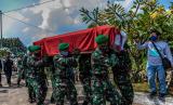 Prajurit TNI AD menggotong peti berisi jenazah Kapten Cpn I Kadek Udi Suardiasa yang merupakan korban tewas dalam kecelakaan Helikopter MI-17 milik TNI AD, setibanya di Bandara Ngurah Rai, Badung, Bali, Minggu (7/6/2020). Jenazah pilot helikopter yang mengalami kecelakaan di kawasan Industri Kendal, Jawa Tengah pada Sabtu (6/6) tersebut rencananya akan dikremasi pada upacara Ngaben di Desa Tukad Sumaga, Kabupaten Buleleng, Bali pada 10 Juni 2020 (FOTO : Nyoman Hendra Wibowo/ANTARA FOTO)