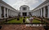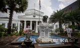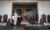 REPUBLIKA.CO.ID, JAKARTA -- Petugas menyemprotkan cairan disinfektan di halaman gedung Museum Nasional, Jakarta, Senin (8/6/2020).