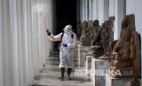 Petugas menyemprotkan cairan disinfektan di gedung Museum Nasional, Jakarta, Senin (8/6/2020). Penyemprotan disinfektan tersebut dilakukan untuk mencegah penyebaran COVID-19 menjelang pembukaan kembali wisata museum pada masa Pembatasan Sosial Berskala Besar (PSBB) transisi fase pertama di Jakarta pada 8-14 Juni 2020. (FOTO : Antara/Dhemas Reviyanto)
