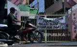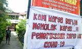 REPUBLIKA.CO.ID, MAKASSAR -- Warga berjalan di dekat spanduk penolakan mengikuti tes diagnostik cepat (Rapid Test) COVID-19 di Makassar, Sulawesi Selatan, Senin (8/6/2020).