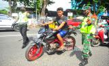 Aparat TNI dan petugas kepolisian mengarahkan pengendara yang kedapatan tidak mengenakan masker saat pelaksanaan Operasi Patuh Penerapan Kebijakan Pemakaian Masker, di Jambi, Senin (8/6/2020). Pemerintah Kota Jambi secara efektif mulai memberlakukan sanksi denda sebesar Rp50 ribu per orang bagi warga yang tidak mengenakan masker ketika berada di ruang publik (FOTO : ANTARA FOTO/WAHDI SEPTIAWAN)