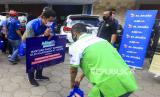 Perwakilan XL Axiata, Mohamad Kriswanto (kedua kiri) memberi salam kepada anggota DIVITRO INKOPPOL RI saat penyaluran bantuan untuk sopir taksi online di kantor DIVITRO INKOPPOL RI Cabang Yogyakarta, D.I Yogyakarta, Selasa (9/6/2020) (FOTO : Antara/Andreas Fitri Atmoko)
