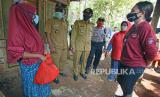 Penasihat Dharma Wanita Kementerian Sosial Grace Batubara (kanan) berbincang dengan warga usai menyerahkan bantuan sembako di Kampung Baru, Petir, Serang, Banten, Selasa (9/6/2020). Pembagian 1 (FOTO : ASEP FATHULRAHMANANTARA FOTO)