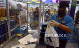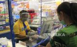 Karyawan melayani pembeli di salah satu pasar swalayan di Manado, Sulawesi Utara, Selasa (9/6/2020). Penggunaan sekat transparan, pelindung wajah, sarung tangan, kewajiban menggunakan masker, mencuci tangan, menjaga jarak, serta pembatasan jumlah pengunjung diterapkan untuk mencegah penularan COVID-19 (FOTO : ANTARA/ADWIT B PRAMONO)