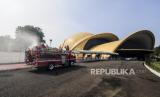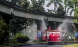 Petugas Damkar DKI Jakarta menyemprotkan disinfektan di Taman Mini Indonesia Indah (TMII), Jakarta Timur, Rabu (10/6). Penyemprotan disinfektan itu sebagai bentuk sterilisasi di area TMII menjelang pembukaan kembali untuk umum pada tanggal 20 Juni Mendatang (FOTO : Republika/Putra M. Akbar)