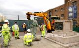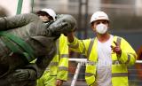 Patung pedagang budak pada abad ke -18 Robert Milligan diturunkan oleh petugas di area Museum London Docklands, Canary Wharf, sebagai gerakan aksi Black Live Matter akibat kematian George Floyd yang meninggal dalam tahanan polisi di Minneapolis, London, Inggris, Selasa (9/6). REUTERS / John Sibley (FOTO : REUTERS / John Sibley)