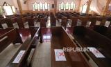 Tanda larangan duduk untuk menjaga jarak terpasang di kursi Gereja Baptis Indonesia Getsemani, Kota Kediri, Jawa Timur, Rabu (10/6/2020). Pemerintah daerah setempat mensosialisasikan sekaligus memastikan kesiapan penerapan protokol kesehatan memasuki era normal baru di tengah pandemi COVID-19 ke sejumlah gereja (FOTO : ANTARA/Prasetia Fauzani)