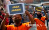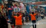 REPUBLIKA.CO.ID, JAKARTA -- Petugas pengelola pasar berkampanye pencegahan COVID-19 dengan membawa poster berisi pesan di Pasar Jatinegara, Jakarta, Kamis (11/6/2020).