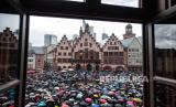Orang-orang berkumpul selama demonstrasi di Frankfurt, Jerman, Sabtu, 6 Juni 2020 menyerukan keadilan bagi George Floyd, yang meninggal 25 Mei setelah ditahan oleh polisi di Minneapolis. (FOTO : Boris Roessler/DPA via AP)