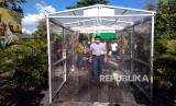 Pengunjung melewati bilik disinfektan sebagai salah satu protokol masuk kawasan Candi Prambanan, Yogyakarta, Kamis (11/6). PT Taman Wisata Candi (TWC) Borobudur, Prambanan & Ratu Boko melakukan berbagai persiapan untuk simulasi pertama praoperasional dengan standar new normal pariwisata di kawasan TWC (FOTO : Wihdan Hidayat/ Republika)