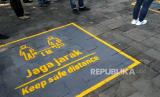 Tanda jaga jarak pengunjung dipasang sebagai salah satu protokol masuk kawasan Candi Prambanan, Yogyakarta, Kamis (11/6). PT Taman Wisata Candi (TWC) Borobudur, Prambanan & Ratu Boko melakukan berbagai persiapan untuk simulasi pertama praoperasional dengan standar new normal pariwisata di kawasan TWC (FOTO : Wihdan Hidayat/ Republika)