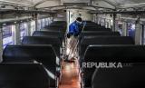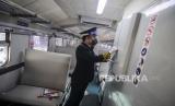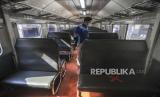 Petugas saat membersihkan kereta Serayu yang akan diberangkatkan di Stasiun Pasar Senen, Jakarta, Jumat (12/6). PT Kereta Api Indonesia telah beroperasi reguler dengan menerapkan protokol kesehatan dan peraturan physical distancing, mulai dari kewajiban penggunaakn masker, jaga jarak sistem antrian dan alat pelindung diri bagi petugas (FOTO : Republika/Putra M. Akbar)