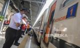 REPUBLIKA.CO.ID, JAKARTA -- Petugas saat melepas keberangkatan kereta Serayu di Stasiun Pasar Senen, Jakarta, Jumat (12/6).
