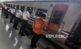 Petugas saat mengecek kesiapan kereta Serayu yang akan diberangkatkan di Stasiun Pasar Senen, Jakarta, Jumat (12/6). PT Kereta Api Indonesia telah beroperasi reguler dengan menerapkan protokol kesehatan dan peraturan physical distancing, mulai dari kewajiban penggunaakn masker, jaga jarak sistem antrian dan alat pelindung diri bagi petugas (FOTO : Republika/Putra M. Akbar)