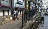 Petugas menyemprotkan cairan disinfektan dan memasang tanda jarak di area Farm House Susu Lembang, Jalan Raya Lembang, Kabupaten Bandung Barat, Jumat (12/6). Persiapan protokol kesehatan tersebut dilakukan dalam rangka memasuki adaptasi kebiasaan baru (AKB) di kawasan wisata Kabupaten Bandung Barat yang rencananya akan dibuka kembali pada tanggal 13 Juni dengan kapasitas pengunjung hanya 30 persen (FOTO : ABDAN SYAKURA/REPUBLIKA)