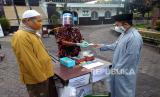 REPUBLIKA.CO.ID, YOGYAKARTA -- Petugas membagikan kartu pembagian tempat sholat Jumat berjamaah di Masjid Syuhada, Yogyakarta, Jumat (12/6).