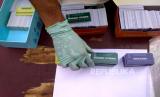 Petugas mengambil kartu pembagian tempat shalat Jumat berjamaah di Masjid Syuhada, Yogyakarta, Jumat (12/6). Shalat Jumat ini yang pertama usai penutupan masjid imbas pandemi virus corona (FOTO : Wihdan Hidayat/ Republika)