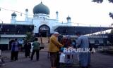 Sholat Jumat ini yang pertama usai penutupan masjid imbas pandemi virus corona. Pada kesempatan ini merupakan simulasi pembukaan masjid dengan protokol kesehatan ketat. Pengukuran suhu tubuh, pengaturan jarak jamaah, dan wajib menggunakan masker.