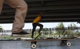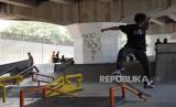 REPUBLIKA.CO.ID, JAKARTA -- Sejumlah remaja bermain skateboard di Skatepark Pasar Rebo, Jakarta, Ahad (14/6/2020). Skatepark tersebut kembali ramai pengunjung di masa Pembatasan Sosial Berskala Besar (PSBB) transisi meski taman itu belum kembali dibuka untuk umum.