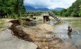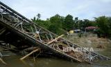 Kondisi jembatan Molintogupo yang ambruk diterjang banjir bandang di Alale, Kabupaten Bone Bolango, Gorontalo, Ahad (14/6/2020). Jembatan penghubung Kecamatan Suwawa Selatan dan Suwawa Tengah sepanjang 125 meter tersebut merupakan akses transportasi utama 60 ribu warga di daerah itu (FOTO : Antara/Adiwinata Solihin)