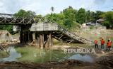 Sejumlah pekerja melihat kondisi jembatan Molintogupo yang ambruk diterjang banjir bandang di Alale, Kabupaten Bone Bolango, Gorontalo, Ahad (14/6/2020). Jembatan penghubung Kecamatan Suwawa Selatan dan Suwawa Tengah sepanjang 125 meter tersebut merupakan akses transportasi utama 60 ribu warga di daerah itu (FOTO : Antara/Adiwinata Solihin)