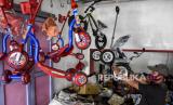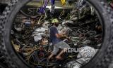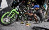 Pekerja melakukan reparasi sepeda di salah satu toko sepeda di Jalan Veteran, Kota Bandung, Senin (15/6). Berdasarkan keterangan pedagang sepeda di kawasan tersebut penjualan sepeda, aksesoris dan onderdil mengalami peningkatan hingga 90 persen seiring dengan berkembangnya tren bersepeda saat pandemi Covid-19 (FOTO : ABDAN SYAKURA/REPUBLIKA)