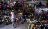 Calon pembeli memilih sepeda di salah satu toko sepeda di Jalan Veteran, Kota Bandung, Senin (15/6). Berdasarkan keterangan pedagang sepeda di kawasan tersebut penjualan sepeda, aksesoris dan onderdil mengalami peningkatan hingga 90 persen seiring dengan berkembangnya tren bersepeda saat pandemi Covid-19 (FOTO : ABDAN SYAKURA/REPUBLIKA)