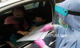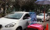 Dua orang guru membagikan buku laporan kenaikan kelas (rapor) kepada wali murid secara Drive Thru di Sekolah Islam Al Bayan, Tangerang, Banten, Senin (15/6/2020). Pembagian rapor di atas kendaraan ini bertujuan untuk menghindari adanya kerumunan sebagai upaya pencegahaan penularan COVID-19.  (FOTO :  ANTARA/Muhammad Iqbal)