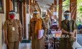 Sejumlah panitia Penerimaan Peserta Didik Baru (PPDB) mengenakan masker dan pelindung wajah saat pelaksanaan pendaftaran PPDB Tahun Pelajaran 2020/2021 di SDN Karangayu 02, Kelurahan Karangayu, Kota Semarang, Jawa Tengah, Senin (15/6/2020). Penerapan sejumlah protokol kesehatan dalam pelaksanaan PPDB itu guna mengantisipasi serta mencegah penyebaran virus Corona baru (COVID-19) di lingkungan sekolah (FOTO : ANTARA/Aji Styawan)