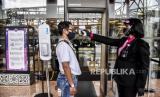 Petugas memeriksa suhu tubuh pengunjung yang hendak memasuki area Trans Studio Mall, Jalan Gatot Subroto, Kota Bandung, Senin (15/6). Pemerintah Kota Bandung kembali membuka 23 mal dan pusat perbelanjaan dengan menerapkan protokol kesehatan serta membatasi jumlah pengunjung menjadi 30 persen dari kapasitas gedung (FOTO : ABDAN SYAKURA/REPUBLIKA)