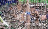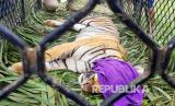 Harimau Sumatra (Panthera Tigris Sumatrae) yang berada didalam perangkap milik Balai Konservasi Sumber Daya Alam (BKSDA) Aceh Selatan di Desa Jambo Dalem, Kecamatan Trumon Timur, Aceh Selatan, Aceh, Senin (15/6/2020). Harimau Sumatra berjenis kelamin betina tersebut diperkiran berumur 3-4 tahun dan berhasil dievakuasi setelah masuk perangkap milik BKSDA setempat. (FOTO : Antara/Khafadi Syawal)