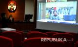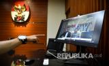 Pegawai KPK memotret layar yang menampilkan sidang putusan dari terdakwa kasus dugaan suap penyaluran pembiayaan skema bantuan pemerintah melalui Kemenpora kepada KONI, Miftahul Ulum di kantor KPK, Jakarta Selatan, Senin (15/6/2020). Majelis Hakim memvonis asisten mantan Menpora Imam Nahrawi tersebut dengan hukuman 4 tahun penjara dan denda Rp200 juta subsider tiga bulan kurungan.  (FOTO : Antara/Sigid Kurniawan)